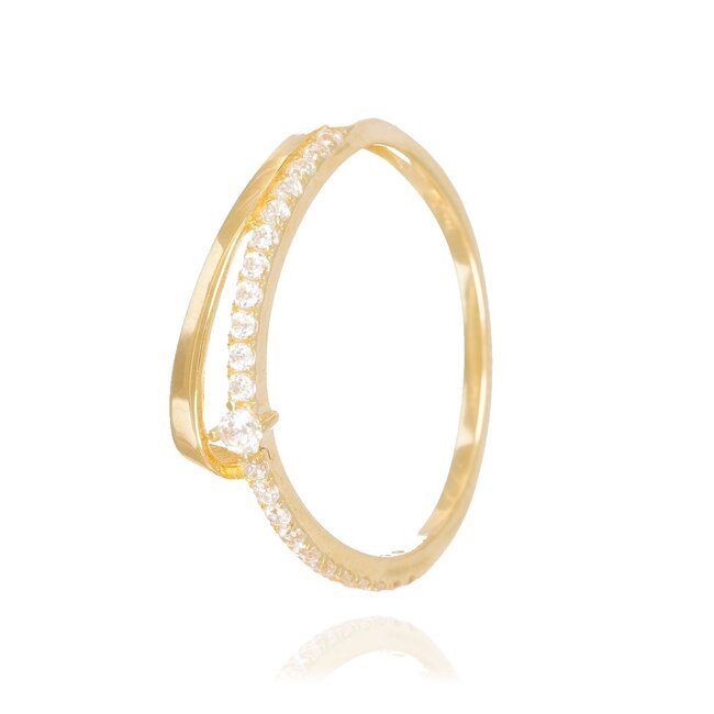 Een stijlvolle crossover/twist-ring in 18 karaat geelgoud, met een pavé rij zirconia en een centrale steen die mooi licht pakt. Elegant voor elke dag en super om te stacken met andere ringen.