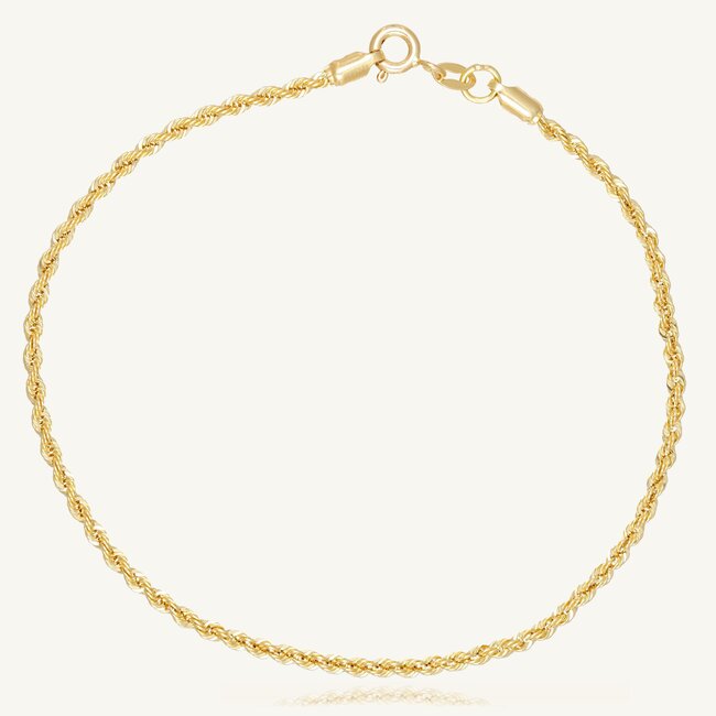 Deze stijlvolle 18 karaat gouden armband heeft een klassiek rope ontwerp dat zorgt voor een elegante en luxe uitstraling. De verfijnde schakels geven de armband een subtiele glans, waardoor dit sieraad perfect is voor zowel dagelijks gebruik als speciale gelegenheden.