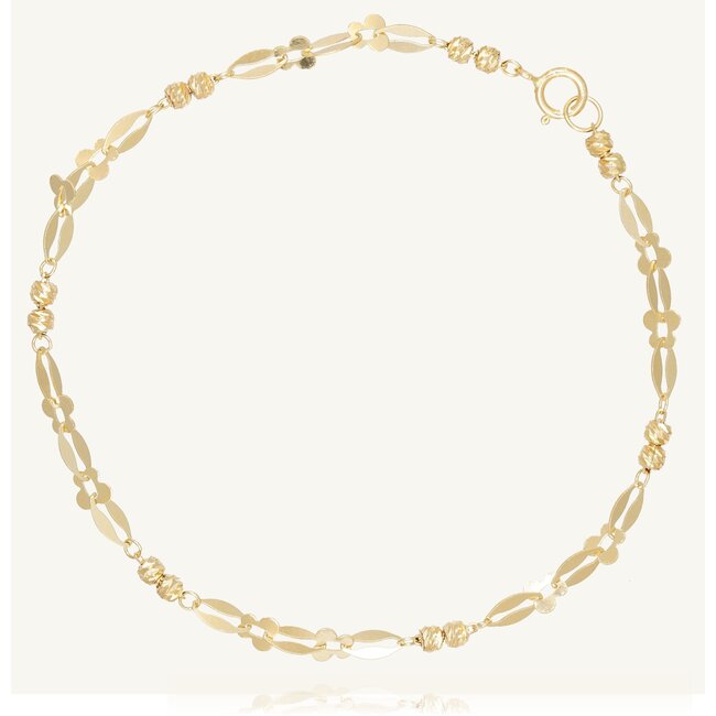 Het speelse patroon van ovale schakels, decoratieve elementen en geslepen kralen geeft de armband een unieke en elegante uitstraling.
