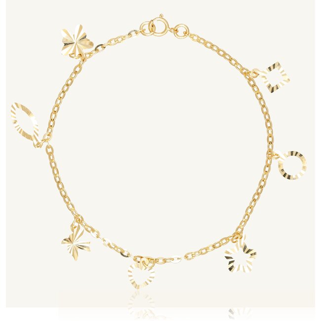 Deze stijlvolle 18 karaat gouden bedel armband heeft een speels en elegant design met verschillende decoratieve bedels.