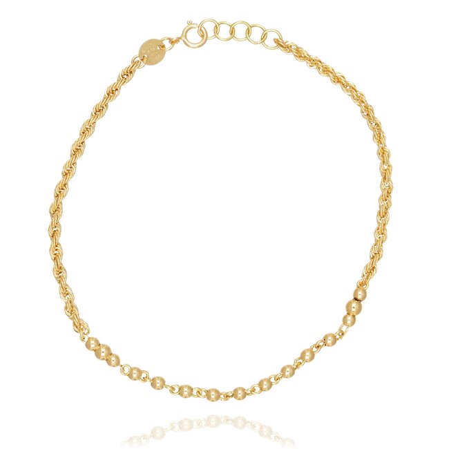Elegante 18 karaat gouden armband met fijne bolletjes en een gedraaide schakelstructuur. Dankzij het verlengkettinkje is de armband verstelbaar van 17 tot 18.5 cm. Een verfijnd en tijdloos sieraad dat perfect is voor dagelijks dragen.