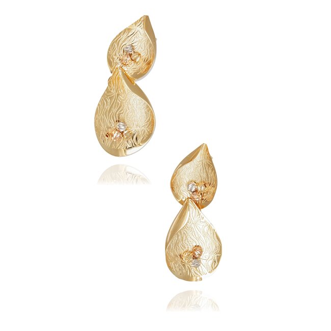 Het ontwerp bestaat uit twee sierlijke delen die elegant onder elkaar vallen en zorgen voor een mooie beweging tijdens het dragen. Hierdoor krijgen de oorbellen een luxe en opvallende uitstraling zonder zwaar aan te voelen.