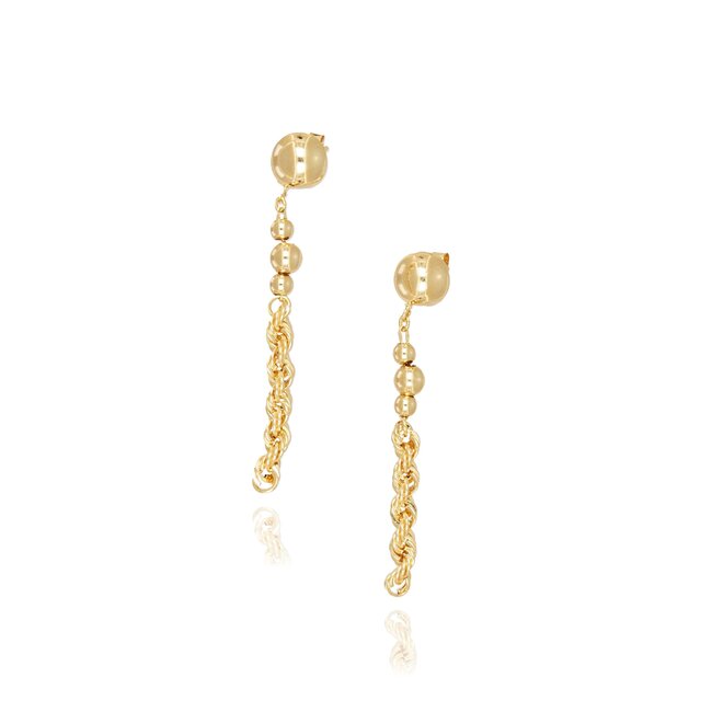 Deze elegante 18 karaat gouden oorbellen combineren een klassieke bolvormige stud met een verfijnde hanger van gouden bolletjes en een gedraaide schakeldesign. De combinatie zorgt voor een speelse beweging en een luxe uitstraling.