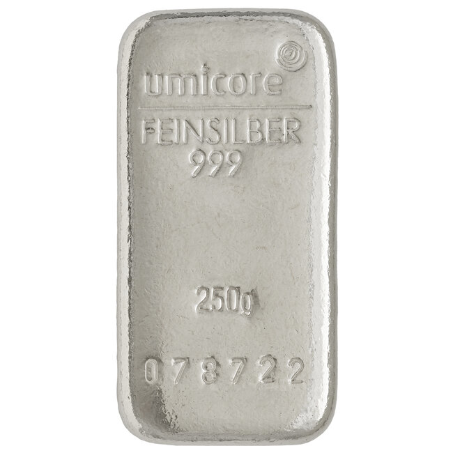 De 250-grams zilverbaren van Umicore bieden een mooie balans tussen een relatief lage premie en toegankelijke instapprijs. Let hierbij op dat zilverbaren zijn belast met 21% BTW en met name interessant zijn voor zakelijke klanten, aangezien de BTW aftrekbaar is. Wij adviseren particulieren om 1 troy ounce zilveren munten te kopen.