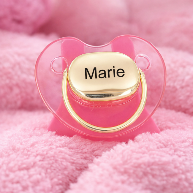 De speen wordt volledig gepersonaliseerd met een naam naar keuze en heeft een luxe, glanzende afwerking. Ideaal als geboorte cadeau of als blijvende herinnering.
