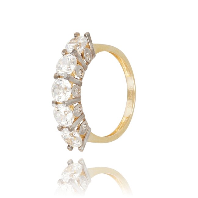 Deze stijlvolle 14 karaat gouden rijring is voorzien van vijf ronde Swarovski-stenen die samen zorgen voor een schitterend en luxe geheel. De dubbele kleurzetting (wit en geel goudlook) geeft de ring een klassiek en tijdloos karakter.