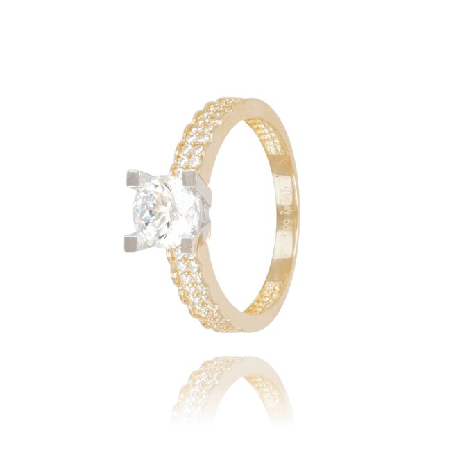 Deze elegante 14 karaat gouden ring is ontworpen met een schitterende ronde solitaire Swarovski-steen die direct in het oog springt. De band is aan beide zijden afgewerkt met een dubbele rij pavé steentjes voor een luxe en sprankelende uitstraling.
