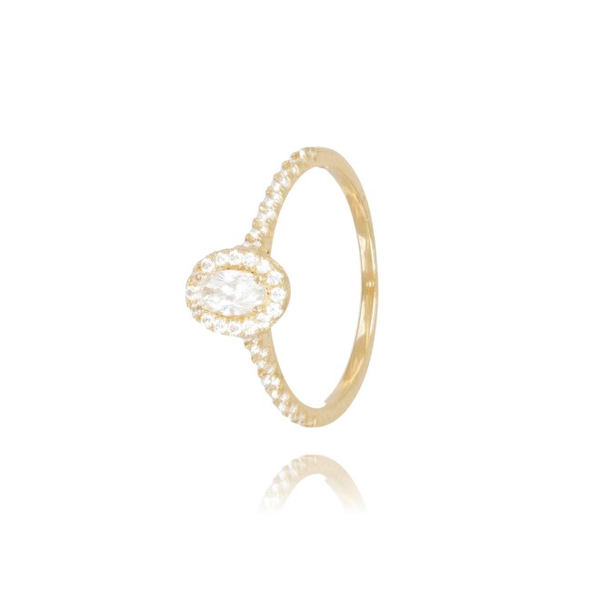 Stijlvolle 14 karaat geelgouden ring met een ovale zirkonia als middelpunt. De steen wordt extra benadrukt door een halo van zirkonia’s, terwijl de slanke band is afgewerkt met pavé zirkonia’s voor maximale schittering.