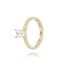 Elegante 14 karaat geelgouden ring met een heldere rechthoekige zirkonia (emerald cut) als middelpunt. De slanke band is rijk afgewerkt met pavé gezette zirkonia’s, wat zorgt voor een luxe uitstraling en veel schittering.